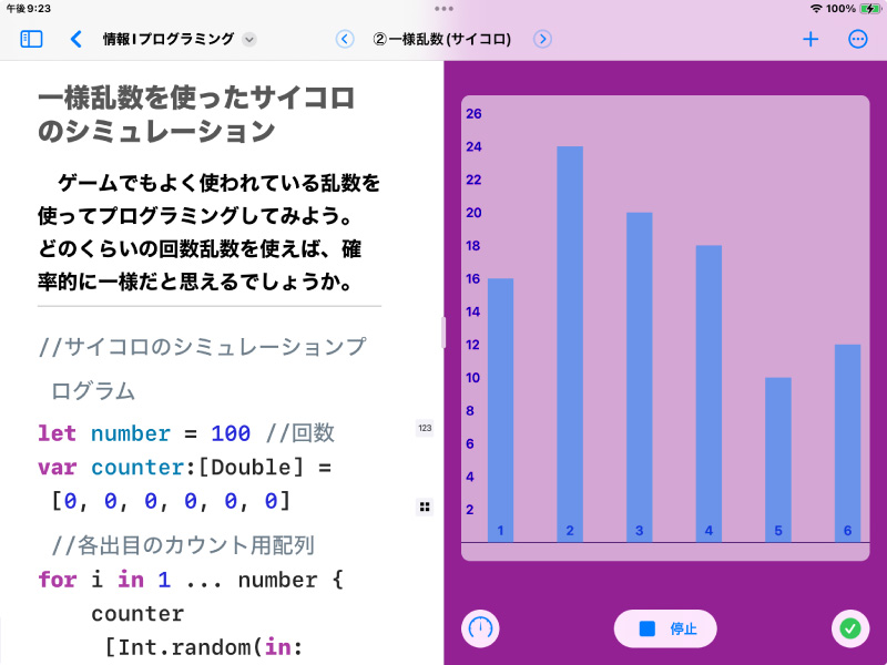 プログラミングの制御構造、データ構造、アルゴリズム、乱数計算、現象のシミュレーションについて基礎的な事項をしっかり学ぶ事ができます。一通りのプログラミングの学習を経て、専門高校などのより専門性が高い高等学校においては、アプリケーション開発や、コードの言語仕様に関するより多様な知識と理解、そしてその実践力を育むことに繋がっていきます。